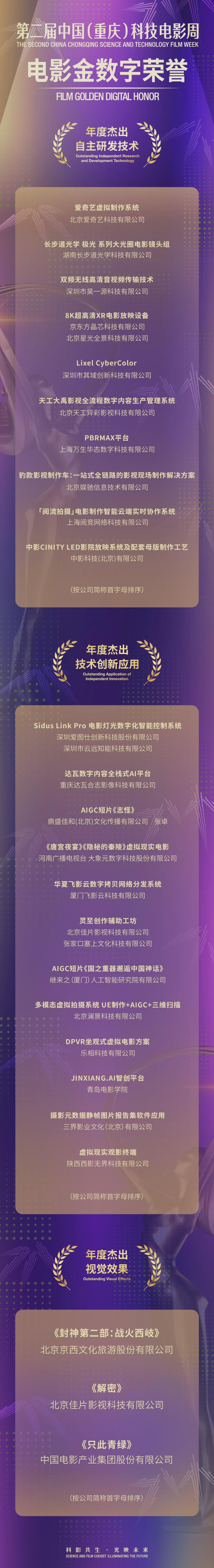 最终,爱奇艺虚拟制作系统、豹款影视制作车、中影CINITY LED影院放映系统及配套母版制作工艺等10个项目获得“年度杰出自主研发技术”。达瓦数字内容全栈式AI平台、AIGC短片《志怪》、《唐宫夜宴》《隐秘的秦玲》虚拟现实电影等12个项目获得“年度杰出技术创新应用”。《封神第二部:战火西岐》《解密》《只此青绿》3部电影作品获得“年度杰出视觉效果”。