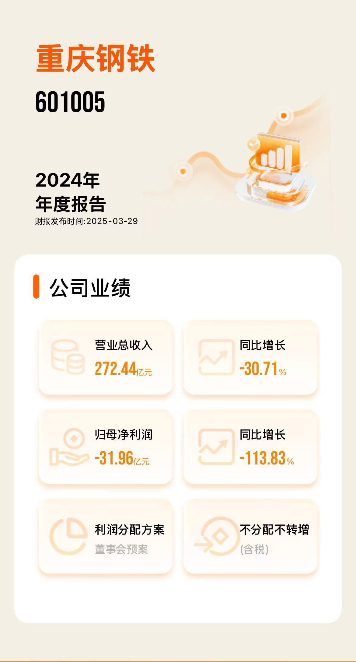 财报显示,2024年全年,重庆钢铁实现营业收入272.44亿元,同比下降30.71%;归母净利润亏损31.96亿元,亏损幅度同比进一步扩大,这也是重庆钢铁连续第三年亏损。