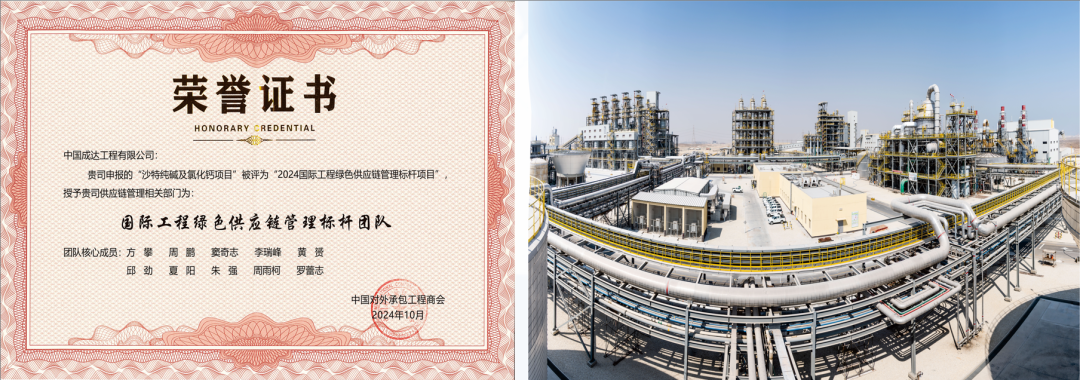 凭借领先的技术优势,成达公司先后完成多个纯碱项目,其中沙特纯碱项目首次将中国技术、中国标准与中国装备引入中东市场,并实现氨碱工艺蒸馏废液零排放,获“国际工程绿色供应链管理标杆项目”称号,有力彰显了中国化学的环保水平和国际竞争力。