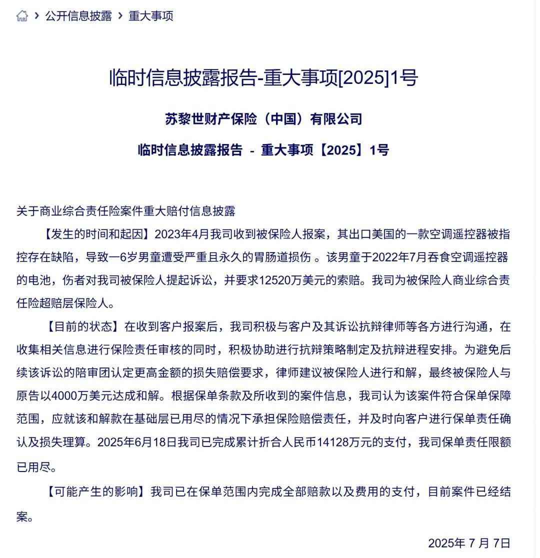 苏黎世财产保险(中国)有限公司(以下简称“苏黎世财险(中国)”)近日披露的重大赔付公告显示领域国际,因一款出口美国的空调遥控器电池被6岁男童误吞导致永久性伤害,被保险人与原告以4000万美元(约合人民币2.87亿元)达成和解,其作为超赔层保险人承担了折合人民币1.4128亿元的赔偿责任。