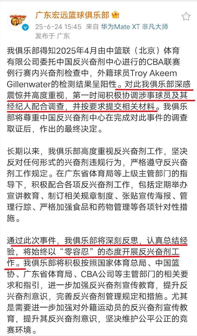 首先广东男篮表示金策略,他们对于吉伦沃特这一次兴奋剂违规的行为,其实也觉得非常的意外和震惊。因为球队最清楚,联盟甚至整个中国体坛对运动员兴奋剂违规这种行为的态度是深恶痛绝的。所以在了解到了这件事情的严重性之后,广东男篮第一时间联系吉伦沃特以及他们的经纪团队,要求他们必须配合中国反兴奋剂机构的调查,而且必须得提交相关的材料说明这一次的情况。