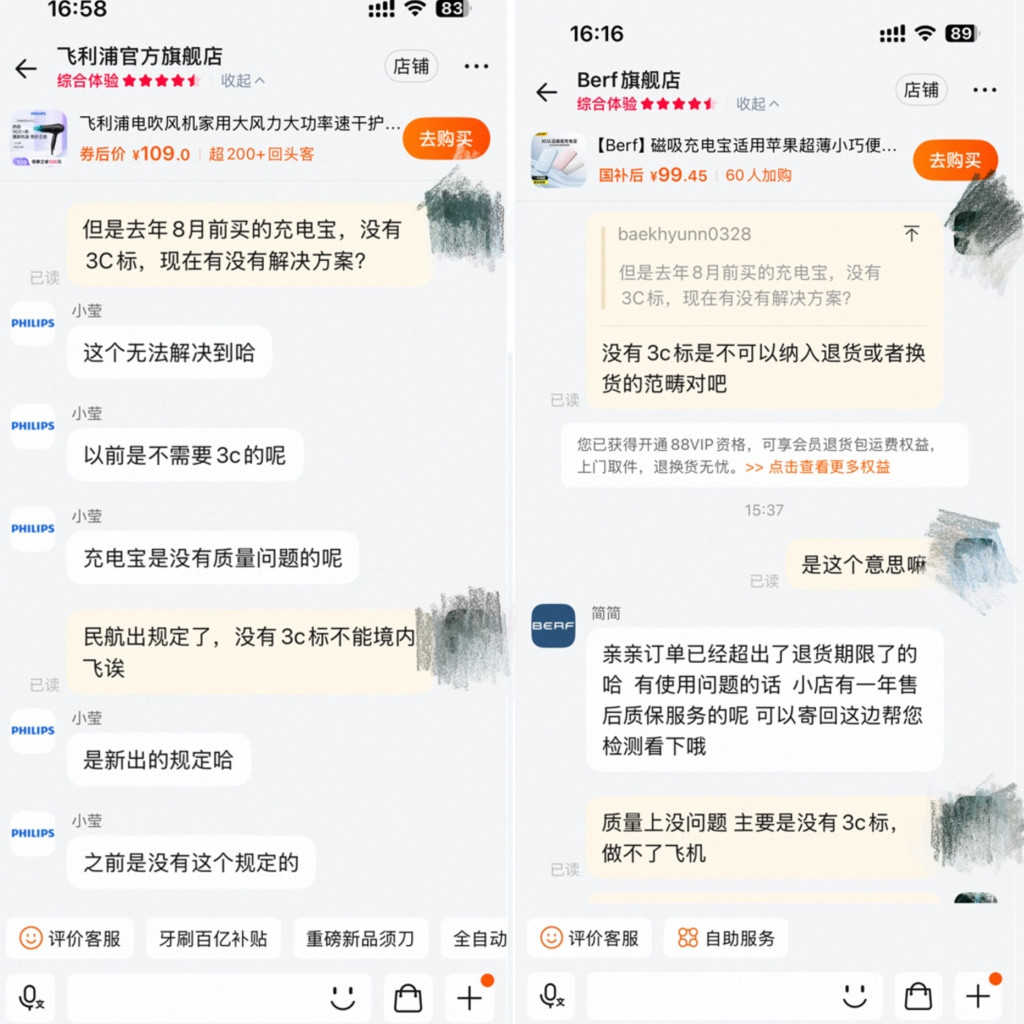 商家客服也普遍强调,国家3C认证去年下半年才发布,可能存在此前产品无3C标识,但“并不影响正常使用”。有的客服甚至建议用户:“如果需要充电宝,乘坐飞机时建议邮寄。”
