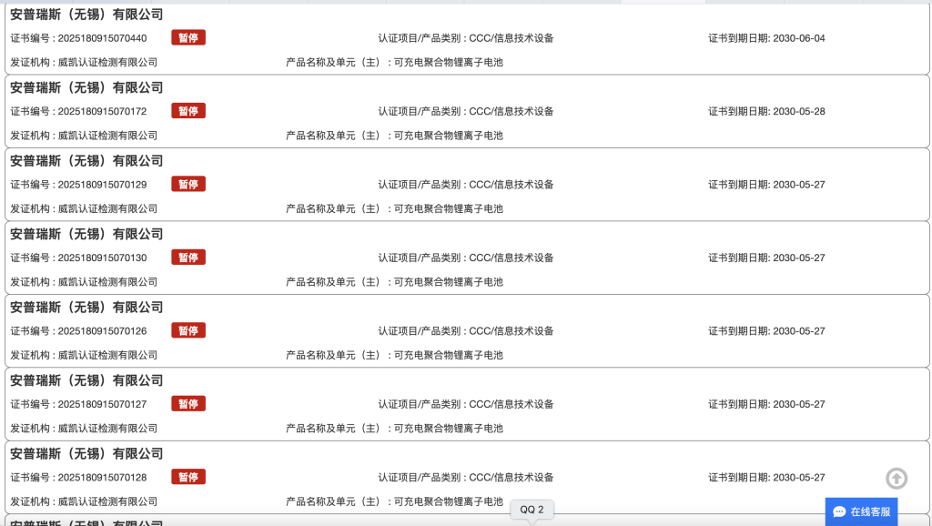中国质量认证中心CQC官网也可查询到,安普瑞斯(无锡)有限公司的11条3C认证信息均已显示被提前暂停,暂停原因为:工厂监督检查不通过、工厂检查有严重不符合项(如产品一致性存在问题等)或工厂检查不符合项报告没有在规定的期限内采取纠正措施报检查组验证并有效。证书状态变化时间均为今年6月10日,原先有效期为2028年到2029年不等。
