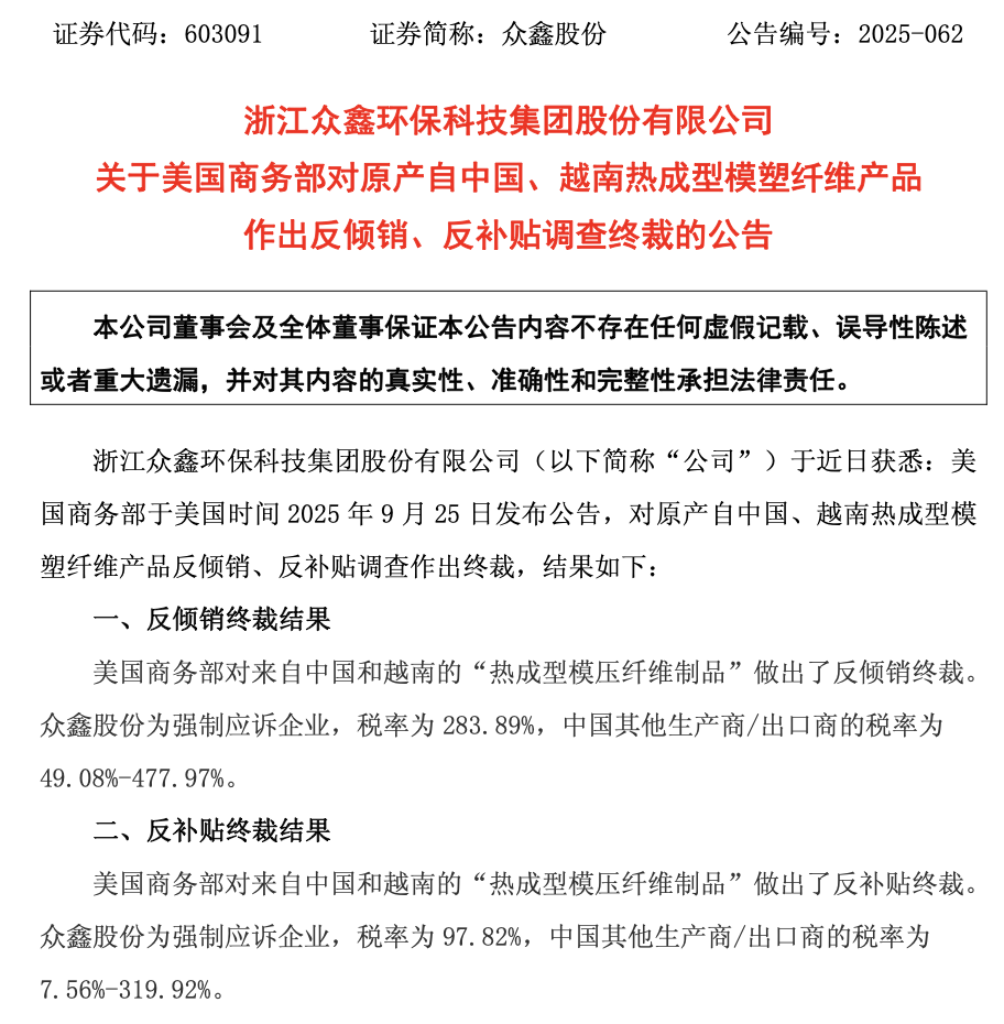 9月28日,众鑫股份(603091)公告,公司于近日获悉,美国商务部于美国时间2025年9月25日发布公告,对原产自中国、越南热成型模塑纤维产品反倾销、反补贴调查作出终裁。