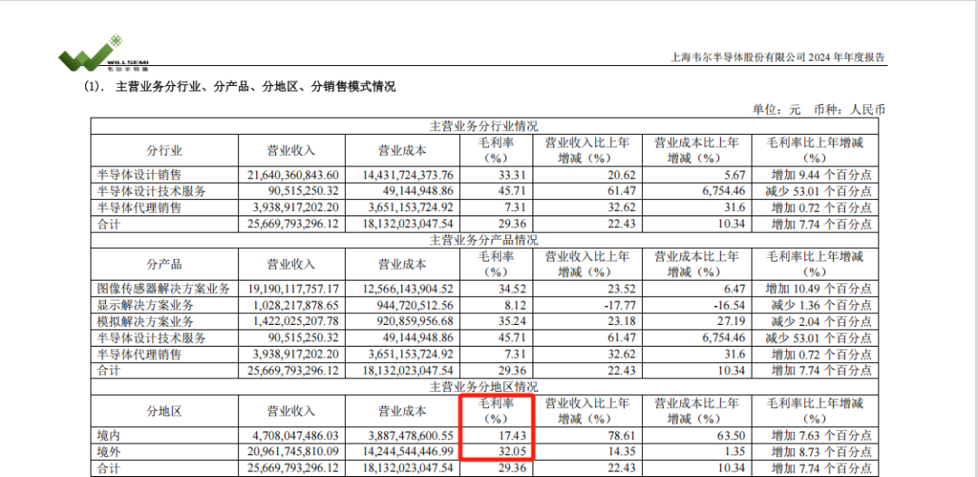 多家申报港股IPO的A股半导体企业,境外业务收入、毛利率均超过境内业务。以韦尔股份为例,其2024年的境内外业务收入分别为47.08亿元、209.62亿元,毛利率分别为17.43%、32.05%。
